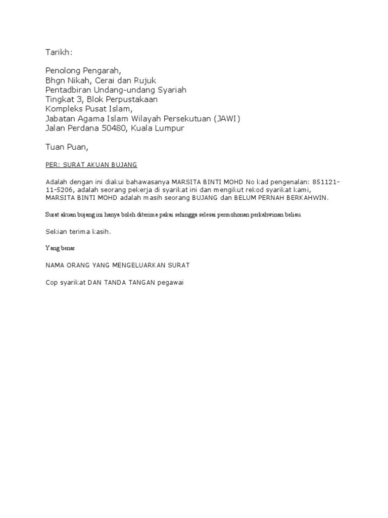 18 Contoh Surat Akuan Sumpah Bujang Jawi from imgv2-1-f.scribdassets.com 100%(2)100% found this document useful (2 votes). Proses mutasi ini mulai efektif pada 1 agustus 201. Related posts to contoh surat pengesahan bujang untuk beli rumah. Contoh surat akuan bujang dari majikan. Contoh surat pengajuan bantuan dana untuk acara reuni. Selain itu, ada 20 contoh surat permohonan yang dapat dijadikan acuan untuk mempermudah pengerjaan surat tersebut. Ada banyak contoh surat undangan pengajian yang sering dipergunakan. Contoh surat pengajuan izin tidak masuk 15.